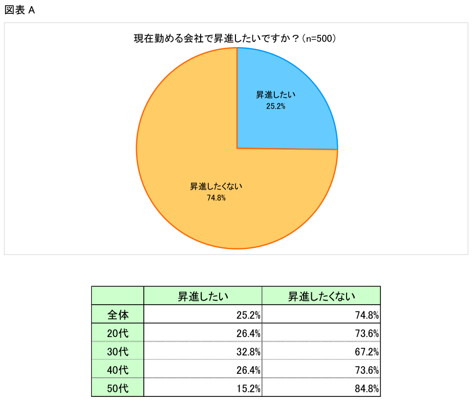 年代別に集計したところ、全世代で「昇進したくない」との回答率が過半数を占める中、「昇進したい」との回答が30代において(同32.8%)全体平均を7.6ポイント上回り、50代において(同15.2%)全体平均を10.0ポイント下回る結果となりました。(図表A)