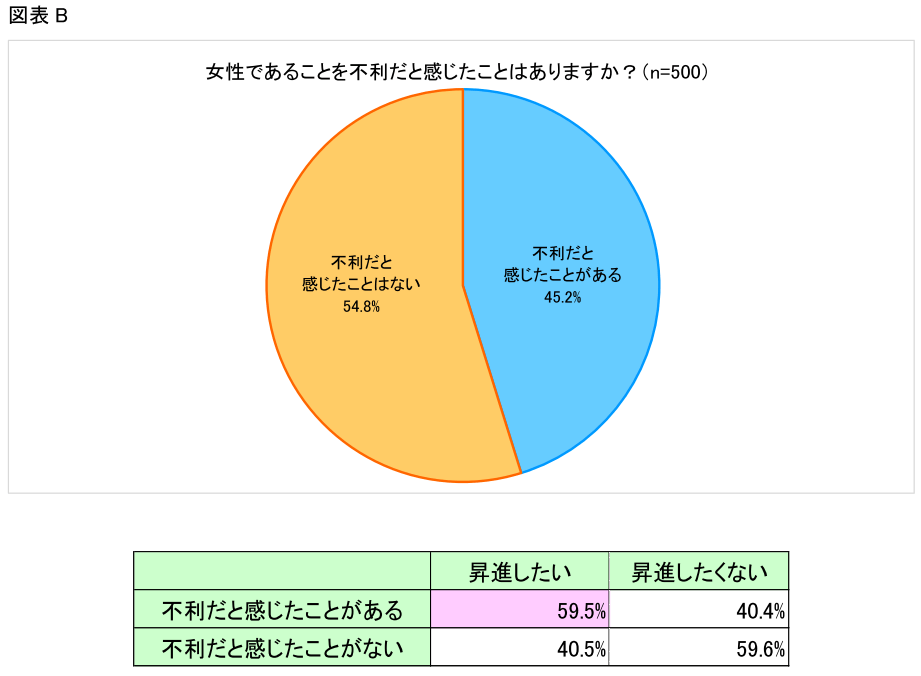 (1)の昇進意欲の有無別に、女性であることを不利に感じているかを集計したところ、「昇進したい」と回答した人の59.5%が「不利だと感じたことがある」と回答しており、昇進意欲が強い人の方が女性であることを不利だと感じる傾向が表れる結果となりました。(図表B)