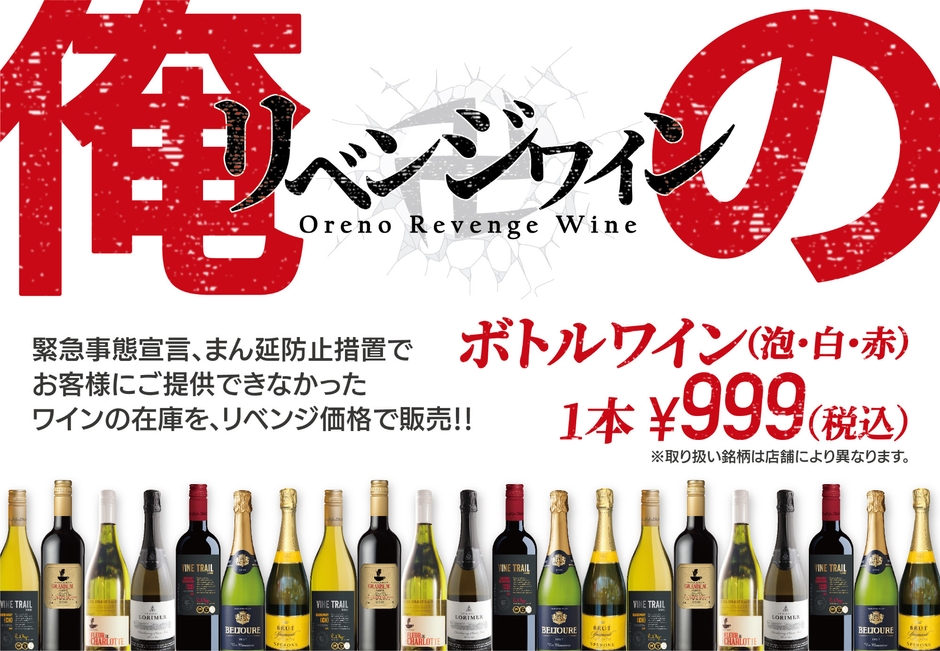 緊急事態宣言解除に伴い開催する【原価度外視!俺のリベンジワインフェア】では、酒類提供禁止期間中に販売することができず、在庫となっていたワインをリベンジ価格の999円(税込)と原価度外視の破格で提供させていただきます。そのため、各店ご用意するアイテムは異なりますが、泡・白・赤と3アイテム以上をご用意させていただきます。酒類業界の活性化も祈念したフェアとなっておりますので、飲みすぎに気をつけていただきながらお楽しみください。