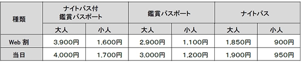 【料金】上記、ナイトパスまたはナイトパス付鑑賞パスポートのとおり