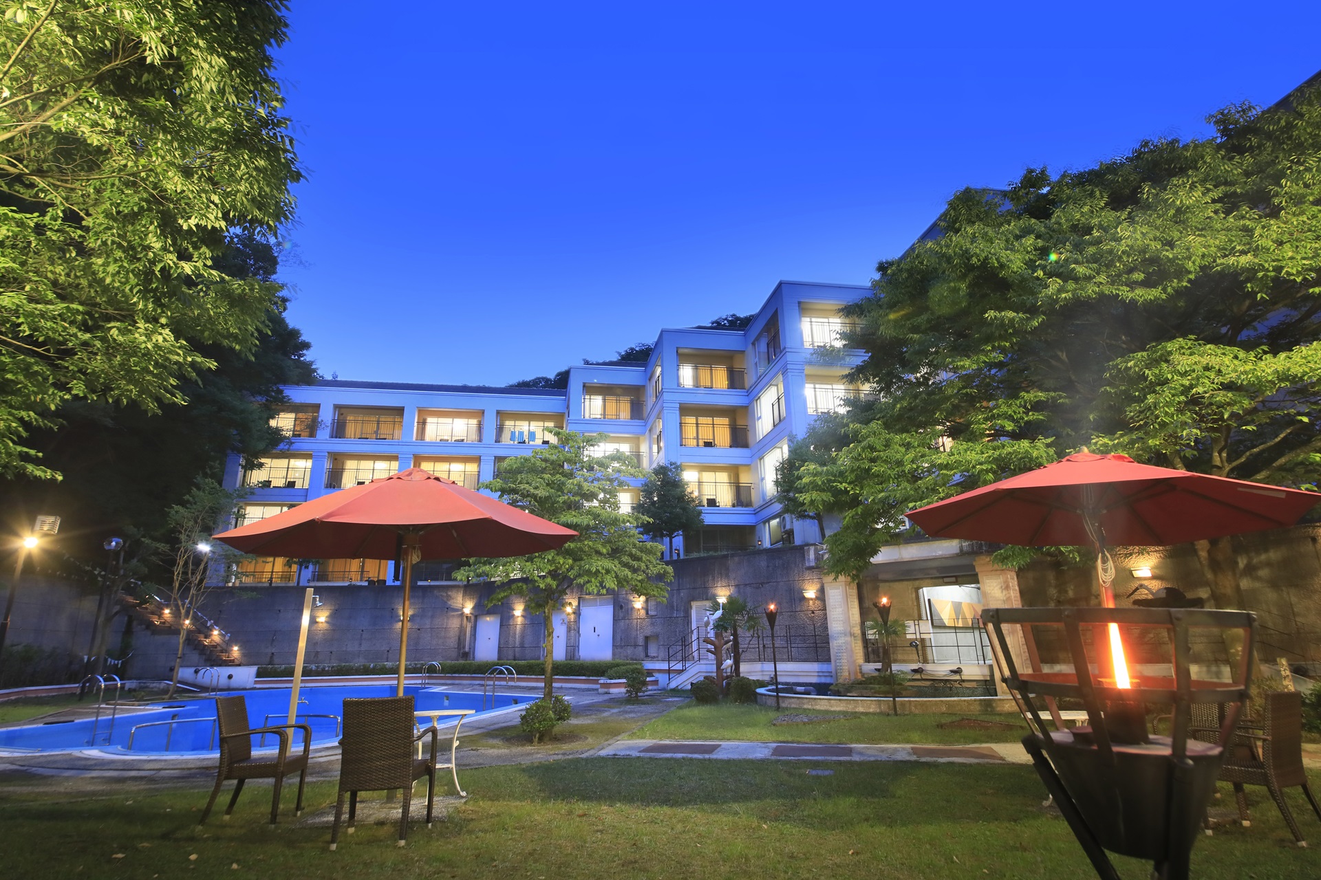 館内設備:レストラン、おもちゃの貸出、宴会場、大浴場(天然温泉・サウナ付き)、プール(夏期のみ)、バーベキューガーデン、ライブラリー、コインランドリー