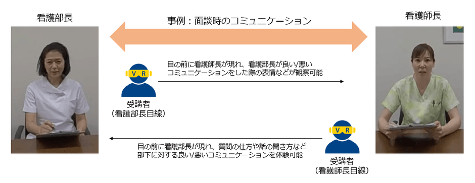 本コンテンツでは、看護部長が看護師長と行う面談を事例とし、上司が部下に対して行う良い/悪いコミュニケーションを視聴することができます。受講者は視点の切り替えにより、看護部長と看護師長の2つの目線で面談を追体験することが可能です。質問の仕方や話の聞き方など相手の悩み事や心配事を効果的に汲み取るために有効なコミュニケーションスキルが追体験により自然と身に付きます。身に付けたスキルをもとに部下である看護師とコミュニケーションを取ることで、心理的負担の原因を見出し、それを改善することで、看護師の心理的な負担軽減が可能です。VRを活用することで、主流である座学形式の研修に比べ、現実さながらのコミュニケーションを体感できるため、これまで以上に高い学習効果が期待できます。