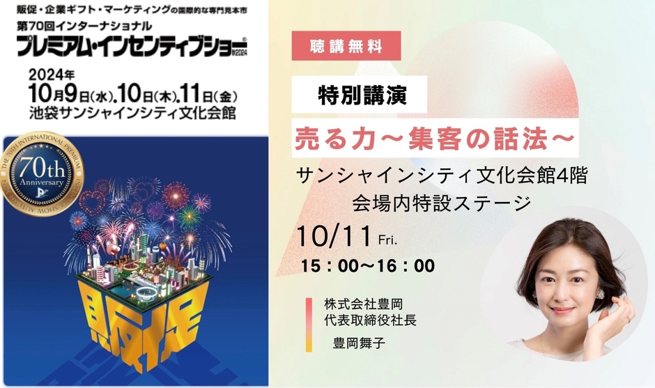 ファッションの専門知識を活かした企業向け研修やコンサルティングを行う株式会社豊岡(本社:東京都千代田区 代表:豊岡 舞子)は、2024年10月9日(水)~10月11日(金)サンシャインシティ文化会館(東京池袋)で開催される第70回インターナショナルプレミアム・インセンティブショー秋2024において最終日となる10月11日(金)に聴講無料の特別講演に登壇します。