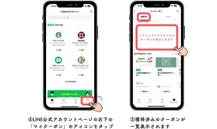 ④LINE公式アカウントページの右下の「マイクーポン」のアイコンをタップ