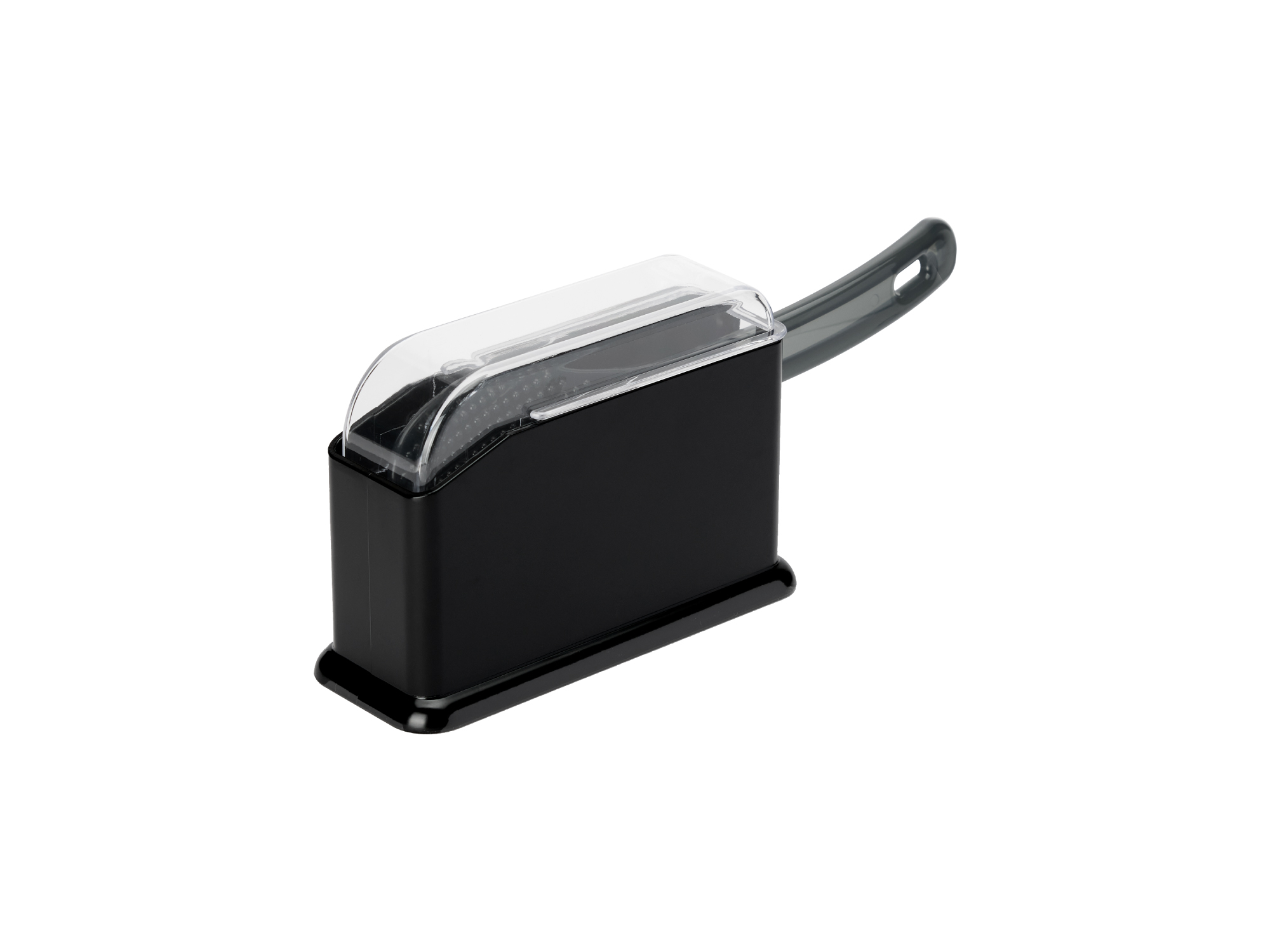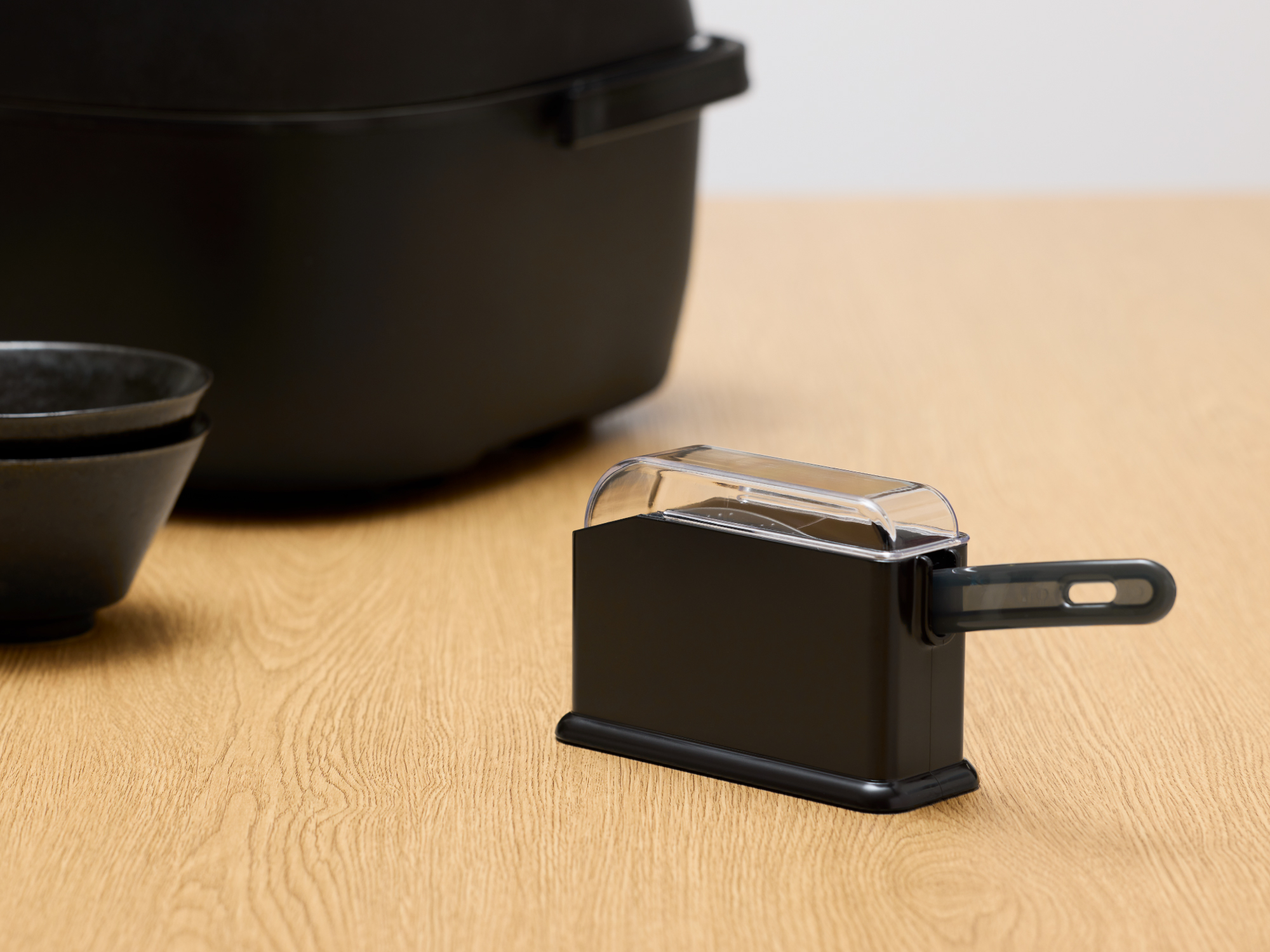 しゃもじを差し込むだけでスマートに自立する収納ケースを用意。蓋付きでホコリの付着を防ぎ、キッチンや食卓で衛生的に保管できます。