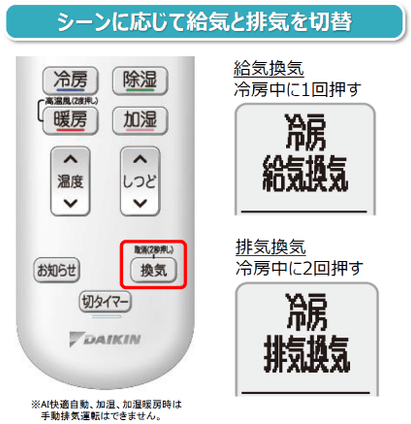 給気換気と排気換気を部屋の状況に応じて、 手動で切り替えが可能