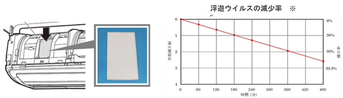フィルターに付着したものを抑制します。実使用空間での実証効果ではありません。