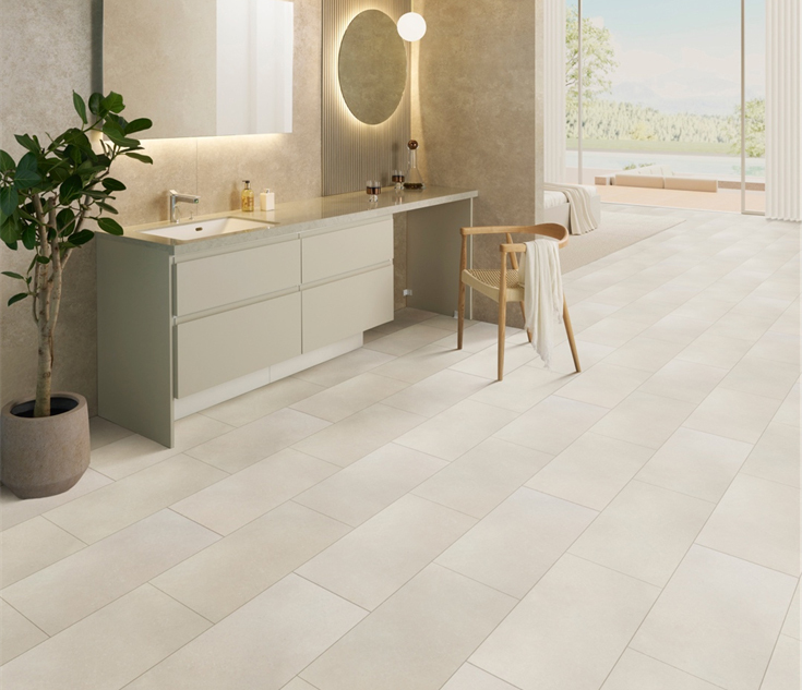 表面材には耐久性・防汚性・耐衝撃性に優れた高圧メラミン化粧板を採用し、さらに実部分には特殊な防水加工を施すことで、これまで敬遠されがちだったキッチンやサニタリー空間でも安心して使用できます。意匠面では、従来のオレフィンシートとは一線を画し、タイルのようにシャープで端正な質感を実現。水や汚れに強い高い機能性を備えながら、空間全体の完成度を高めるデザイン性を両立しました。床暖房にも対応しており、水回りはもちろん、デザイン性と耐久性が求められるさまざまな空間に対応可能です。機能と意匠の両面から、水回り空間の床材選びに新たな価値を提案します。
