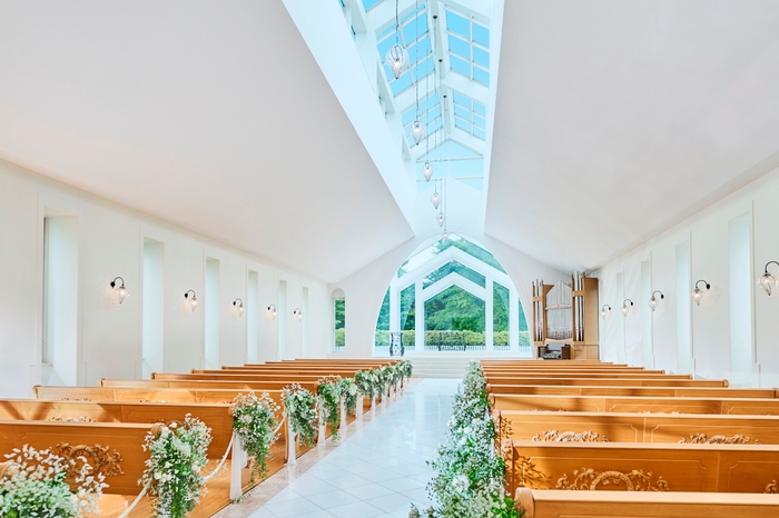 空と自然光、森を感じる、純白の独立型チャペル。天窓から柔らかな光が降り注ぐ大理石のバージンロードは、東北一を誇る長さ30m。ドレスが美しく映えるバージンロードを進んで、緑が彩る「森の祭壇」で永遠の誓いを。高い天井に反響するパイプオルガンでの生演奏も、このチャペルの魅力です。