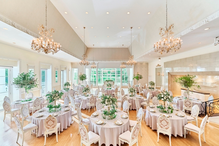 森の奥に佇む「大人の隠れ家」。大きな窓が広がり、どの席からもガーデンが望める解放感で溢れる邸宅。木目のアクセントが会場をシックにまとめています。