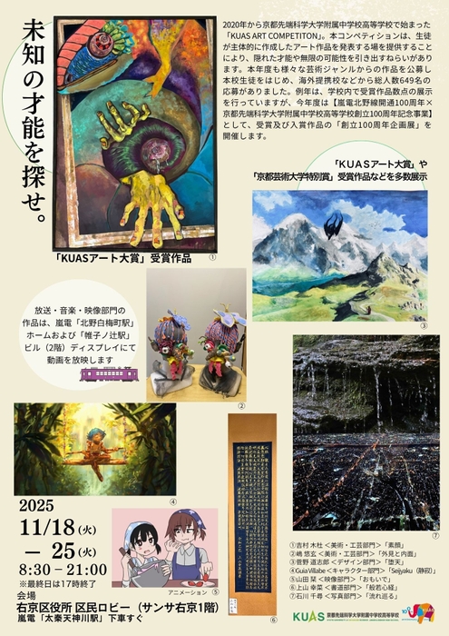 合わせて、沿線の京都先端科学大学附属中学校高等学校が本年5月15日(木)に創立100周年を迎えたことから、同校との芸術をテーマとした100周年記念事業として、11月3日(月・祝)から帷子ノ辻駅ビル内で、北野線の歩みを写真やパネルで振り返る写真展を実施、また11月18日(火)から「『KUASアートコンペティション※』創立100周年企画展」の入賞作品を収めた映像を帷子ノ辻駅ビル商業施設「ランデンプラザ帷子」と北野白梅町駅で上映します。