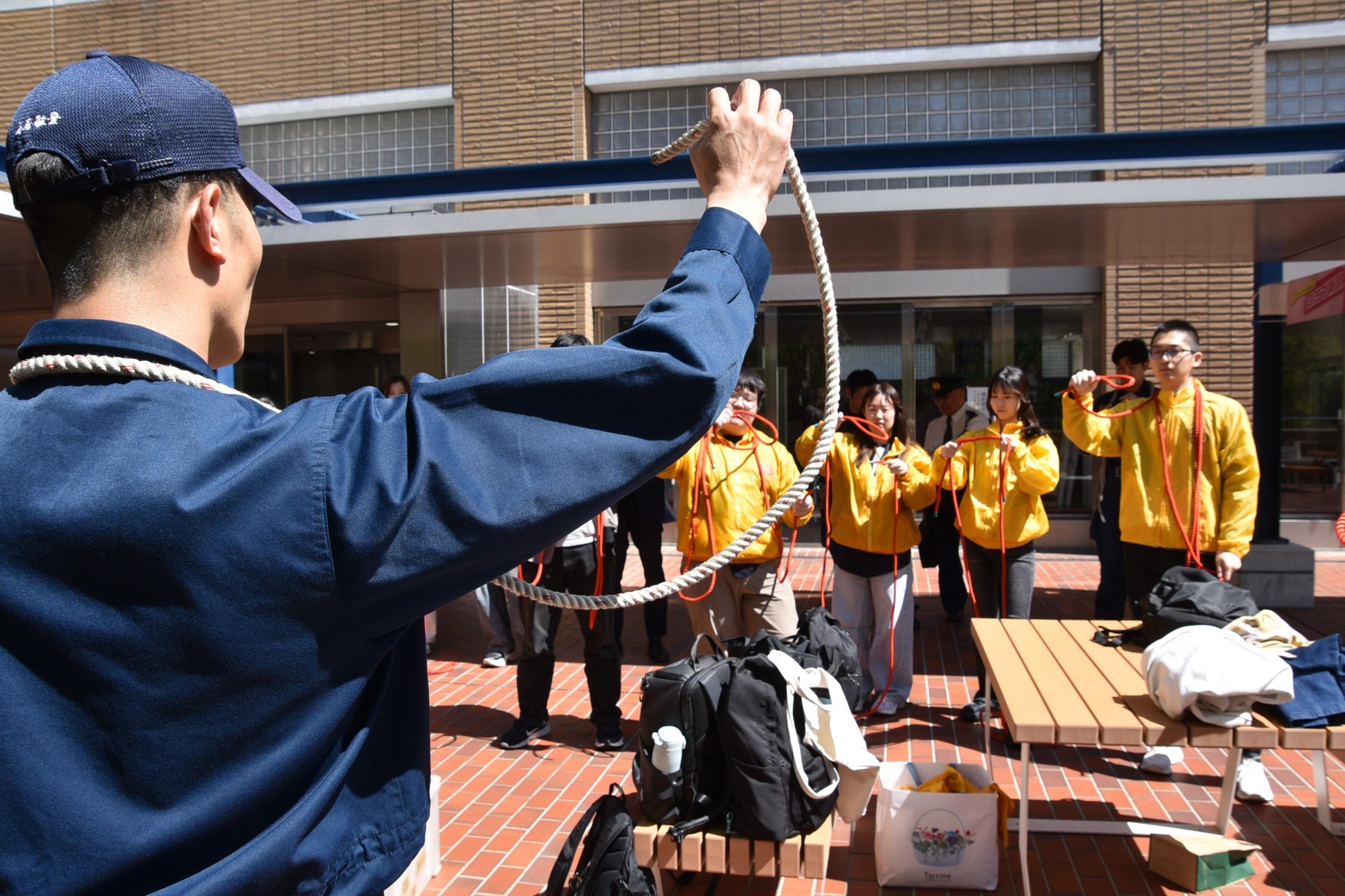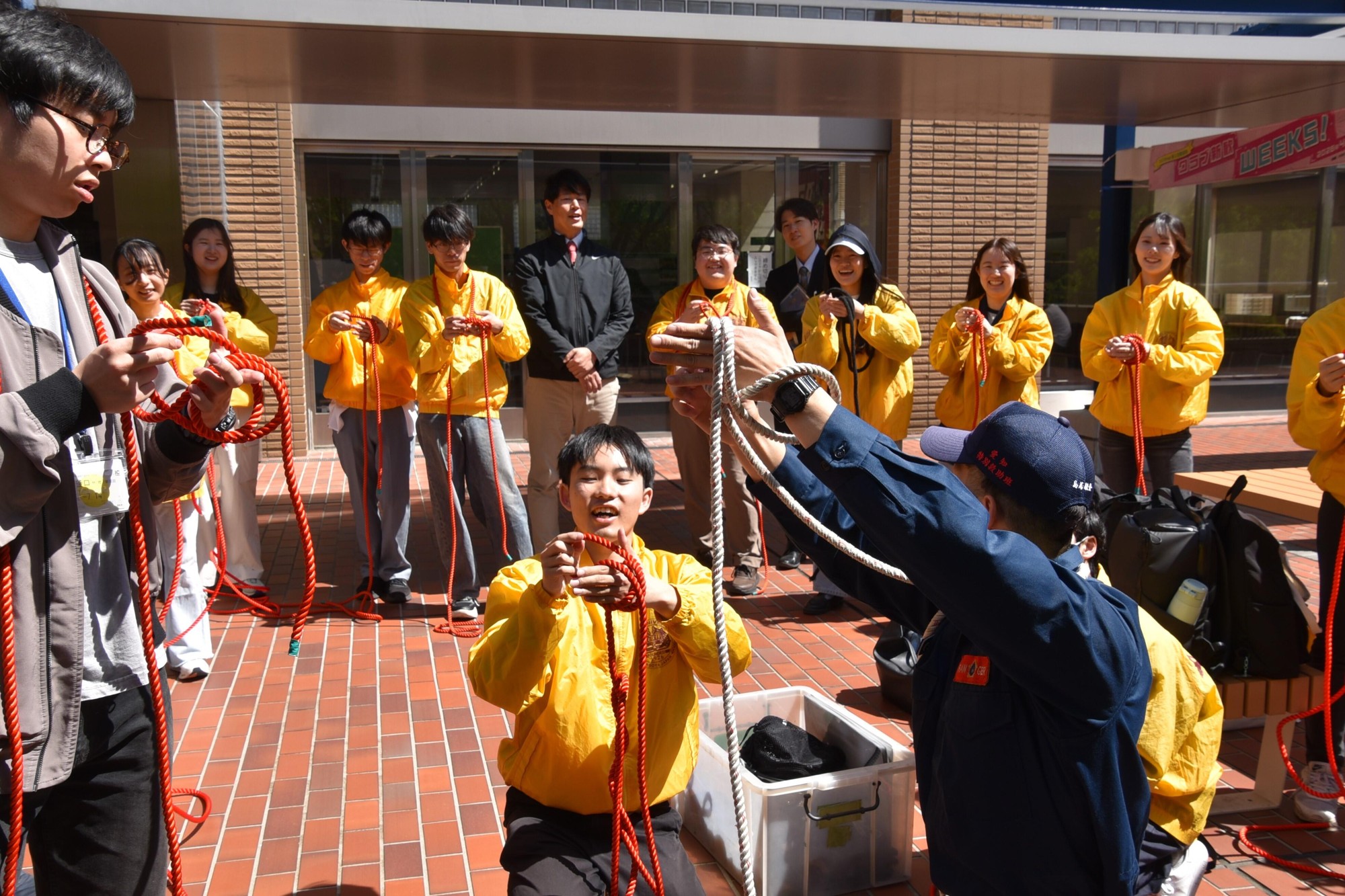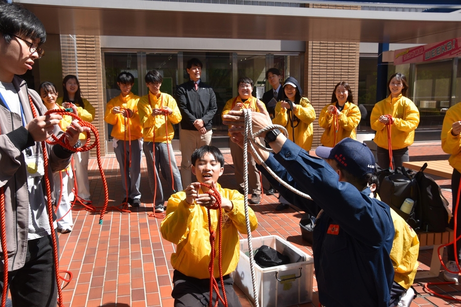 この日は学生約20人が参加し、ロープを使った人命救助や能登半島地震の被災地での活動など、災害救助の経験が豊富な署員から、「本結び」「もやい結び」「体もやい結び」「二重継ぎ」「蝶結び」の5種類のロープの結び方について、正しい手順やポイント、それぞれの結び方の特徴や有効な用途などを、約1時間にわたって教えてもらいました。