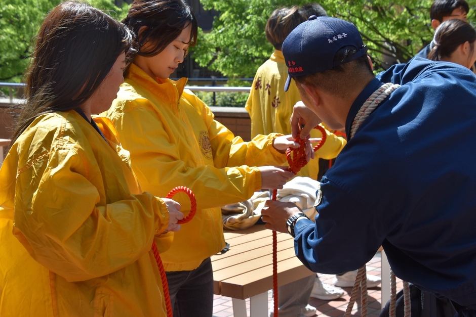 災害ボランティア活動に取り組んでいる学生団体「ボランティア協議会」は4月16日、愛知県警天白警察署と合同で、災害時や緊急時などに役立つロープの結び方を学ぶ講習会を天白キャンパスのタワー75で開催。学生たちは署員から本結びやもやい結びなどの正しい結び方や災害時の活用方法などを学びました。