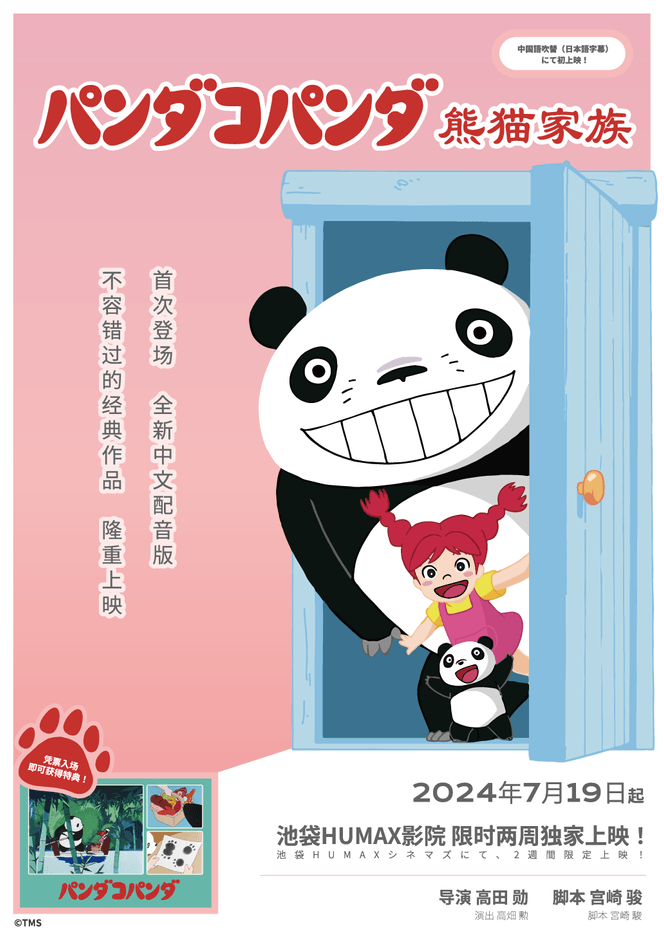株式会社トムス・エンタテインメント(本社:東京都中野区 代表取締役社長:竹崎忠 以下 トムス)は、原案・脚本・画面設定:宮崎駿、監督:高畑勲による名作アニメ『パンダコパンダ』『パンダコパンダ 雨ふりサーカス』について、中国語吹替版(日本語字幕付き)にて2024年7月19日(金)~8月1日(木)、池袋HUMAXシネマズで限定上映いたします。