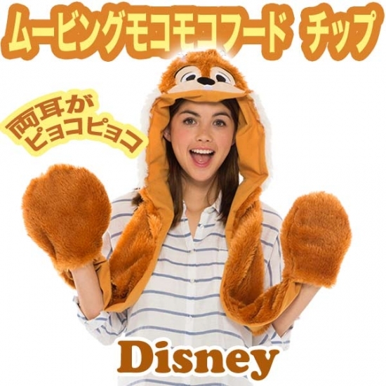 1つ目は、『チップ&デール』のチップのもこもこフードです。手のひら部分あるポンプを押すと、チップの両耳がピクピク動くフードなんですよ!