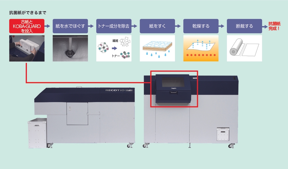 デュプロ精工株式会社(本社:和歌山県紀の川市、社長:橋口 英樹)は、小林製薬株式会社(本社:大阪市中央区、社長:小林 章浩)が販売する、抗ウイルス性を併せ持った持続性抗菌剤「KOBA-GUARD(コバガード)」を活用し、使用済みの紙をオフィス内で抗菌再生紙として再生する技術の開発を開始しました。今後この技術を確立、デュプロ精工の小型製紙装置「RECOTiO(レコティオ)」に展開し、近年の衛生意識の高まりによる清潔性や安全性などの衛生管理ニーズに応えることで、時流に沿った環境活動をより推進していきます。