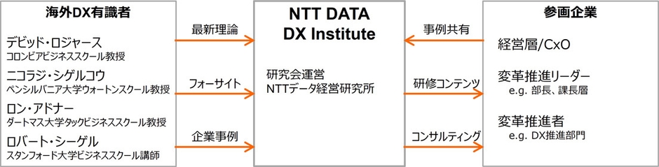 当社では、「DXの本質を見極めることが企業の持続的成長の要となる」という認識から、2023年4月にNTT DATA DX Instituteを設立し、DX推進の中核を担う日本企業を支援すべく、米国の著名ビジネススクールでDXの研究および高度人材育成をリードし、グローバル企業へのアドバイスなどを通じて実務も熟知する第一人者を講師として招聘しています。米国の著名ビジネススクールの講師陣から最新事例や理論を直接学ぶことでDXの本質への理解を深めるだけでなく、各社の課題を少人数で議論する相互の学び合いから意思決定のための新たな気づきを得る場として、通年で研究会を運営してまいります。
