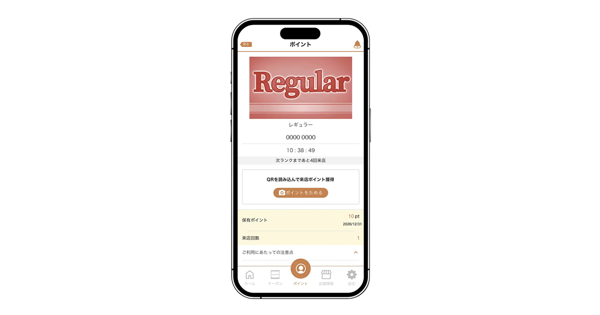 店舗に併設されているQRコードを読み込むことで、来店ポイントの獲得・利用ができます。ご来店回数に応じた5つの会員ランクがあり、ランクアップの際には、お得なクーポンと交換できるポイントのプレゼントがあります。