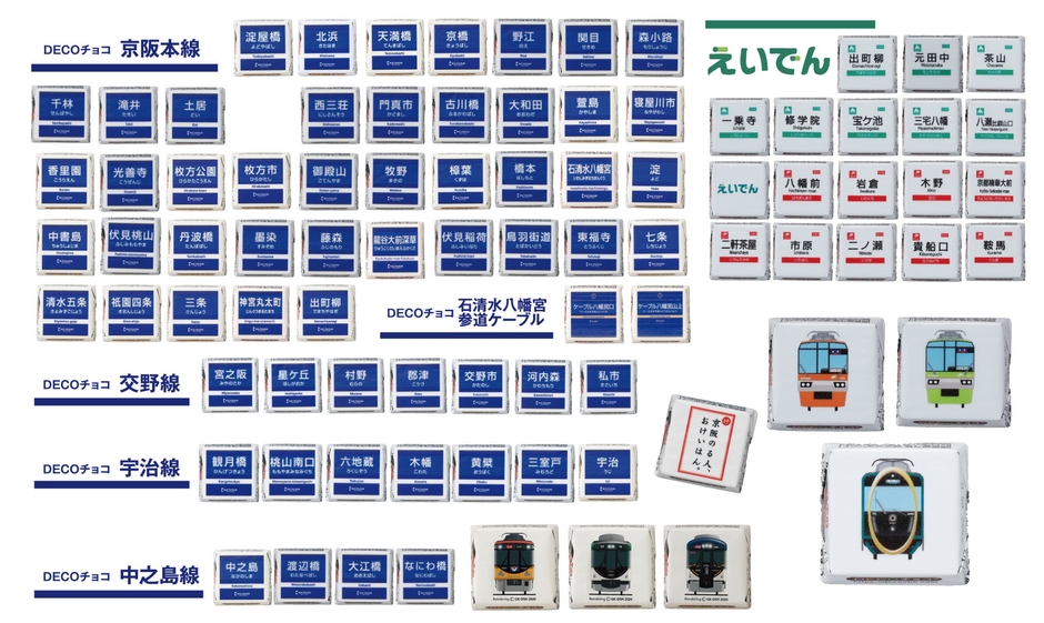 また、守口店、くずはモール店では、京阪電気鉄道株式会社が実施した企画 「京阪電車×響け!ユーフォニアム2021」の連携企画として、アニメ 「響け!ユーフォニアム」とコラボレーションしたDECOチョコ オリジナル、プリe-ma、缶キャンディを限定販売いたします。さらに毎年ご好評をいただいている京阪電車の駅名標をプリントしたDECOチョコ オリジナルでは、今回ECサイトで限定セットを販売していた、叡山電車のシリーズが登場いたします。