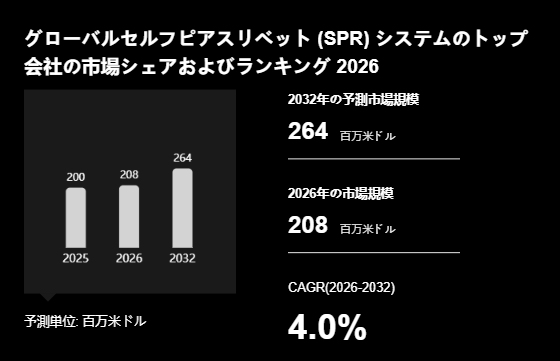 YHResearch調査チームの最新レポート「グローバルセルフピアスリベット (SPR) システムのトップ会社の市場シェアおよびランキング 2026」によると、世界のセルフピアスリベット (SPR) システム市場は2025年に200百万米ドル規模に達すると予測され、2026年には208百万米ドルに拡大する見込みです。2032年までに264百万ドルに達すると予測されており、2026年から2032年までの期間における年平均成長率(CAGR)は4.0%と予想されています。