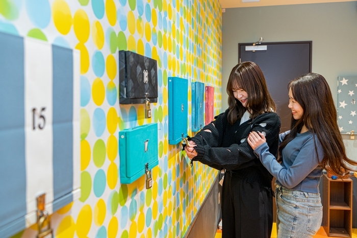 さらに、各イベントの外壁には、それぞれのメインビジュアルを反映した個性的な壁紙が施されています。例えば、青一色で統一された『Escape from The BLUE ROOM』や、水色とオレンジ色の長方形が鮮やかに配置されたインパクト抜群の『アイテムだらけの部屋からの脱出』など、テーマごとの特徴を活かしたデザインが魅力です。イベント参加後は、この壁紙を背景に脱出成功/失敗パネルを手に写真を撮り、ぜひSNSでシェアしてください!