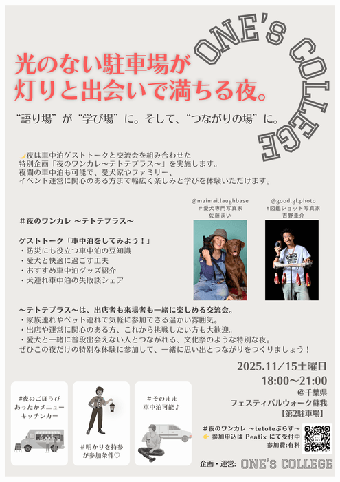 昼はハンドメイド雑貨やペットグッズなど100店舗以上が集まる大規模マーケット、夜は車中泊ゲストトークと交流会を組み合わせた特別企画「夜のワンカレ ~テトテプラス~」を実施します。夜間の車中泊も可能で、愛犬家やファミリー、イベント運営に関心のある方まで幅広く楽しみと学びを体験いただけます。
