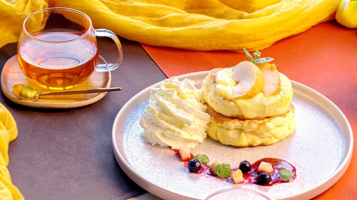 「ミエレ ザ ガーデン」で大人気のパンケーキに秋メニュー『アップルブリュレパンケーキ』が新登場!淡路島産の卵と牛乳を使用し、ふわふわに焼き上げたパンケーキに、バニラビーンズ香るカスタードを乗せ、表面をブリュレ仕立てに。仕上げにしっかりした酸味と 滑らかな舌触りが特徴の“紅玉りんご”を砂糖・バター・シナモンで味付けし、オーブンでじっくり焼いた風味豊かな焼きりんごをトッピング。さらに、パンケーキと相性抜群の紅茶3種も新登場!爽やかな甘みが特徴の南国フルーツ“サワーサップ”をアッサムセイロンティーにブレンドした『スウィートベルガモットティー』。甘く芳醇な香りのハニーとほのかな刺激を楽しめるジンジャーをバランスよくブレンドした『スウィートハニージンジャーティー』、フランスの伝統菓子“タルトタタン”をイメージした、洋菓子のようなコク深い香りが特徴の『りんごキャラメルティー』を用意。秋めく淡路島で、素敵なティータイムをお楽しみください。