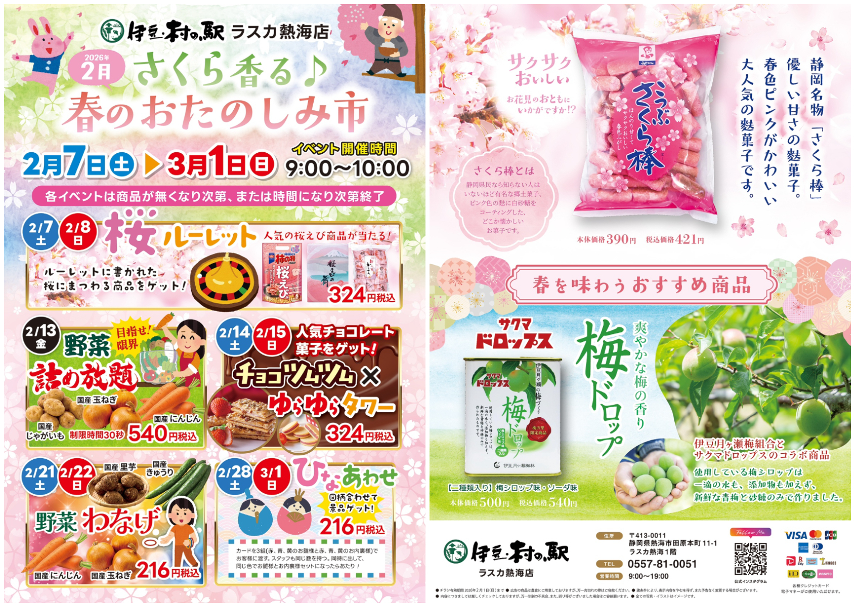 伊豆・村の駅 ラスカ熱海店(所在地:静岡県熱海市田原本町)では、2026年2月、桜やバレンタイン、ひなまつりなど季節の行事にちなんだ体験型イベントを開催いたします。