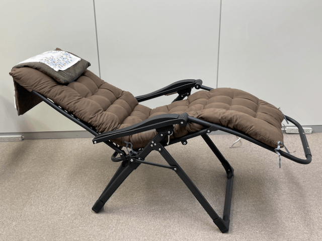 当社のピロースピーカーは布団の上に置き枕を乗せて使いますが、当日はリクライニングチェアの背もたれに掛けるヘッドレスト型の試作を使用し椅子に座り背もたれを倒した状態で試聴いただけます。