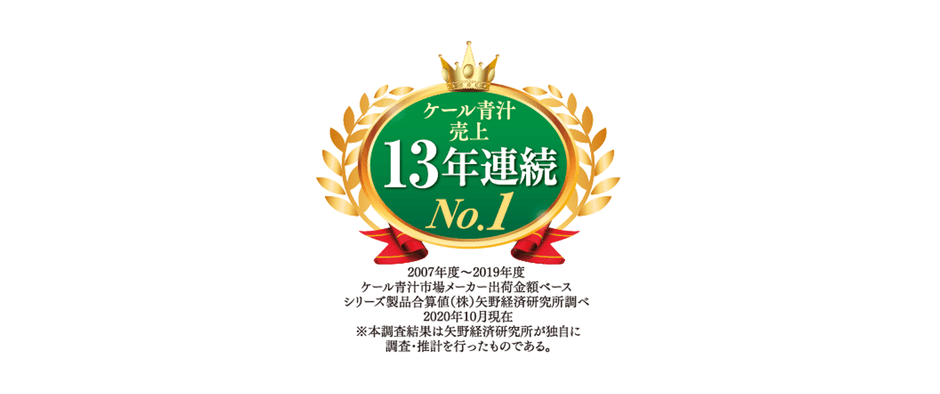 ※1 2007年度~2019年度ケール青汁市場メーカー出荷金額ベースシリーズ製品合算値株式会社矢野経済研究所調べ(2020年10月現在)。