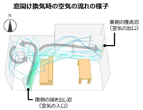当社が行ったシミュレーションでは、2つの窓を開けて換気をする時、外の空気とともに窓から部屋に入ってきた花粉は、気流に乗って窓の正面の壁にぶつかり、壁に沿って左右に広がっていくことがわかりました。また、空気清浄機を使用する時は、空気が入ってくる窓の正面の隅に置くことで、壁に沿って広がる花粉を効率的に吸い込むことや、風量が大きいほどたくさんの花粉を吸い込むこともわかりました。花粉は重く床に落ちるため、空気清浄機の使用と併せて「床に溜まった花粉をふき取る」「掃除機で吸い込む」ことも効果的です。