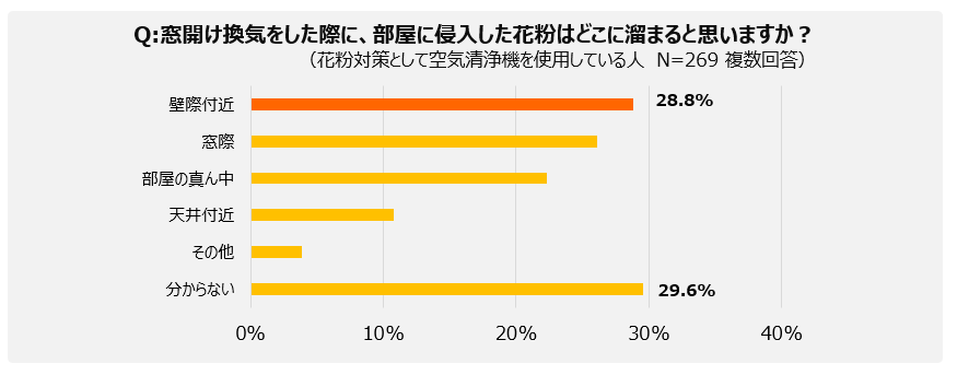 「窓開け換気をした際に、部屋に侵入した花粉はどこに溜まると思いますか?」という質問に対して、「壁際付近」と正解を選べた人は28.6%で、「分からない」と回答したのは38.0%でした(窓際:21.4%、部屋の真ん中:17.0%、天井付近:9.5%。その他:2.7%)。窓開け換気の際に、花粉が溜まりやすい場所を把握している人はあまり多くないようです。また、花粉対策として空気清浄機を使用している人に限ってみても、「壁際付近」と正解を回答できたのは28.8%、「分からない」と回答したのは29.6%でした。効果的な場所に空気清浄機を置いて「窓開け換気」と「花粉対策」の両立を行えている人は少ないようです。