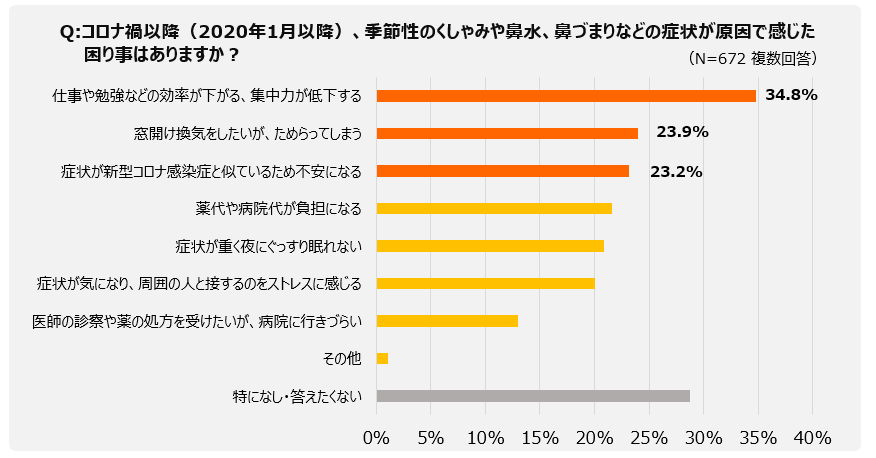 今年の花粉シーズンは「窓開け換気をしたいがためらう」「症状が新型コロナ感染症と似ているため不安」など、コロナ禍ならではの困りごとが上位