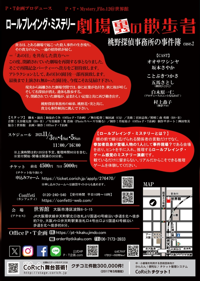Office P・T企画主催、『ロールプレイング・ミステリー 劇場裏の散歩者 桃野探偵事務所の事件簿 case.2』が2023年11月3日 (金・祝) ~2023年11月5日 (日)に世界館(大阪府大阪市港区波除6-5-15)にて開催されます。