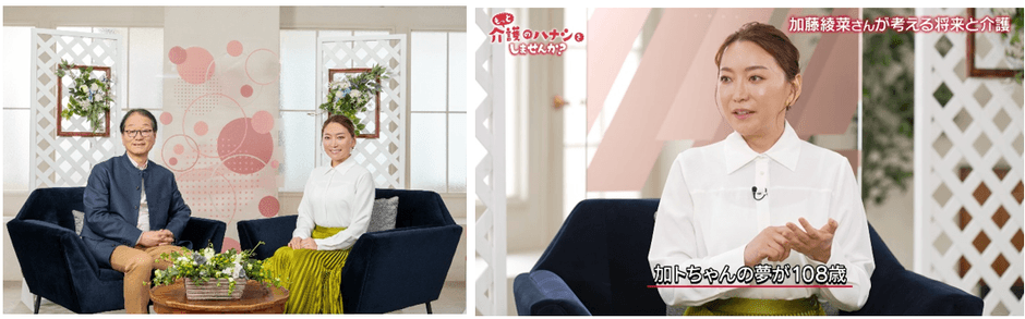 本番組には、タレントの加藤綾菜さんと、SOMPOグループで介護事業を担うSOMPOケア株式会社 相談役会長の遠藤健が出演。介護を主題に全3つのテーマに沿ってトークします。テーマは「食へのこだわり」「人を支えること ~加トちゃんの夢実現のために~」「介護業界のDX ~未来の介護の在り方~」。介護に関心があり、介護関連の資格を取得している加藤綾菜さんが、加トちゃんこと、夫の加藤茶さんとの生活や、介護への考え方、自身の経験などについて赤裸々に語ります。加藤茶さんの夢を叶えるサポートや、健康面を気遣って試行錯誤してきたことなど、夫を支えるために行動していることを明かしました。
