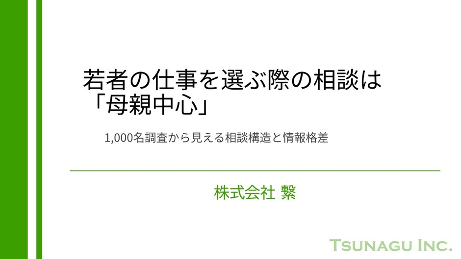 株式会社繋(本社:東京都千代田区、代表者:大岩 政博)は、若者のキャリア選択に関する15歳から24歳の男女1,000名へのアンケート結果を発表しました。調査では、仕事を選ぶ際に話を聞こうと思う相手の中心が「母親」であることが明らかになり、情報源の偏りが不安や職業選択の制約を生んでいる実態が浮き彫りになりました。本リリースでは、調査結果の詳細と、仕事の選択における心理構造や相談ネットワークの課題を解説します。