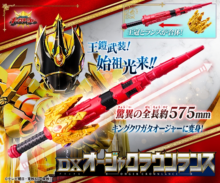 『王様戦隊キングオージャー』の「クワガタオージャー」がパワーアップした姿「キングクワガタオージャー」が使用する新武器「DXオージャクラウンランス」が登場。全長は約575mmの超大型サイズで3つのモードを楽しむことができます。