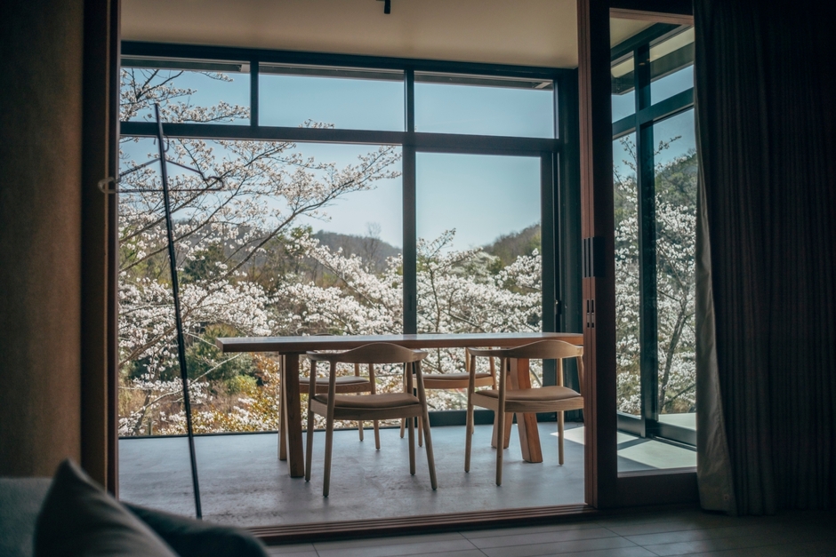客室では、静けさと自然の美しさに囲まれながら、心からのリラクゼーションをお楽しみいただけます。春の光が満ちる環境で、読書や瞑想、またはゆったりとした時間をお過ごしいただけます。