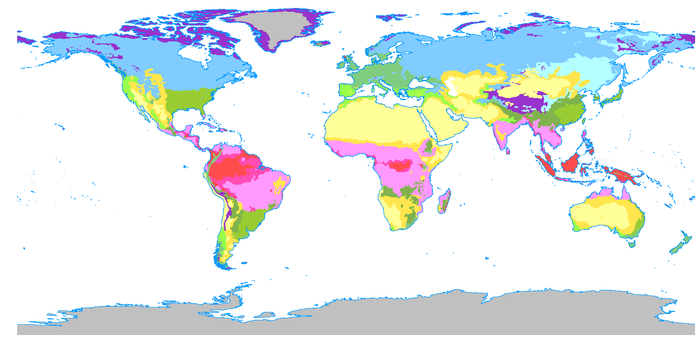地理の教科書には、特定のテーマをわかりやすく説明するために「主題図」と呼ばれる地図が使われています。次のような地図は、「ケッペンの気候区分図」と呼ばれる典型的な主題図の一つです。