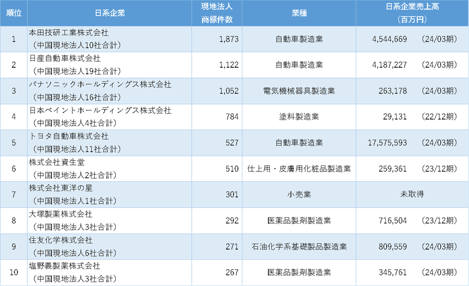 今回の「中国日系企業の商標保有数ランキング」では、1位が本田技研工業(商標保有数1,873件)、2位が日産自動車(同1,122件)、3位がパナソニックホールディングス(同1,052件)という結果になりました。