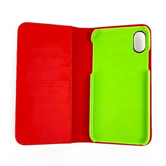 中を開くと、鮮やかな赤♪スマホを取り付ける部分は、ライトグリーンです。カードポケットもついていて、機能性もバツグンです。