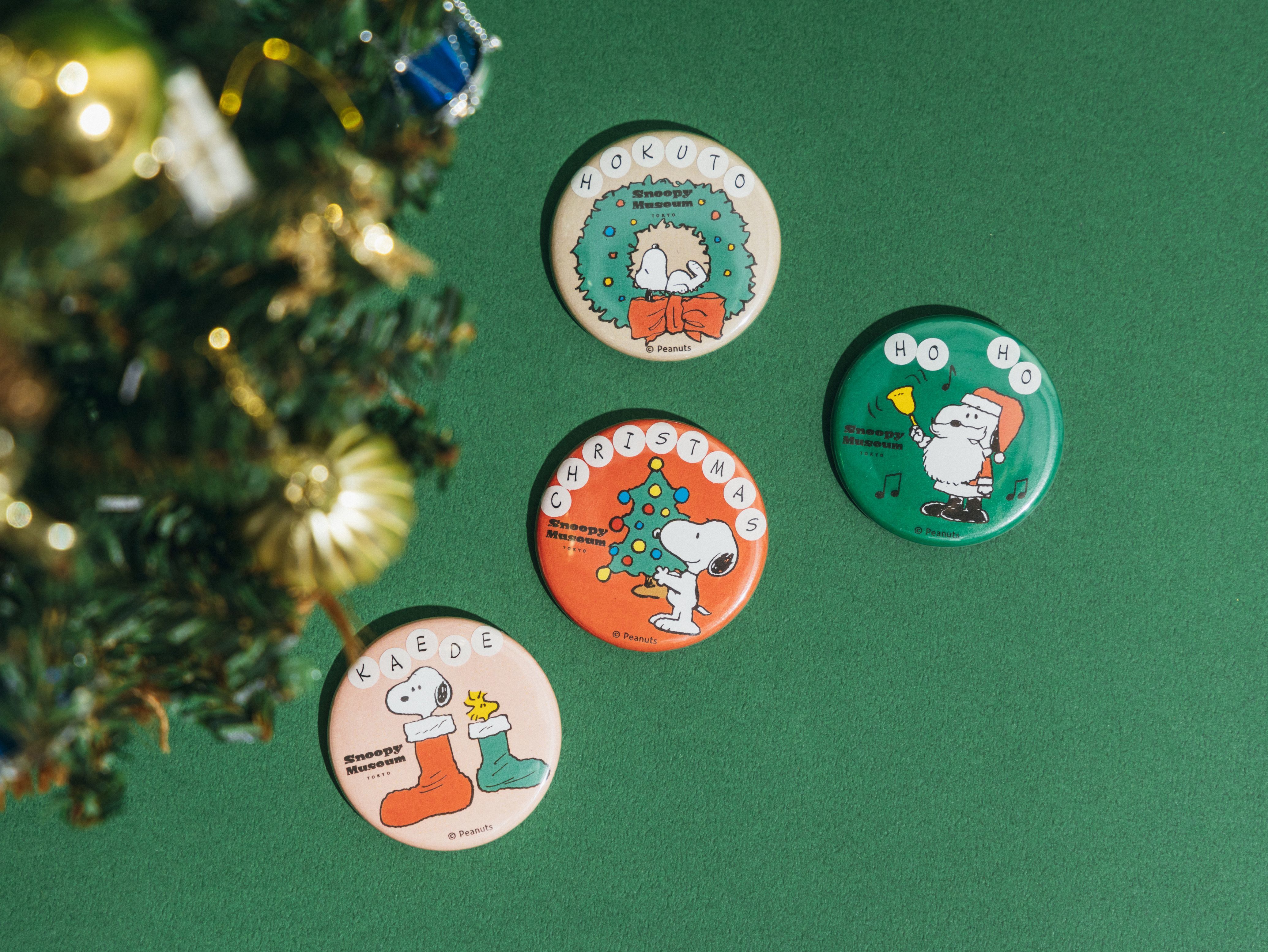 ランダムで1つ出てきたデザインに、コミックと同じシュルツフォントのアルファベットシールを貼って、お名前などを入れて自分だけのオリジナル缶バッジにすることができます。期間限定のクリスマスデザインが登場します。