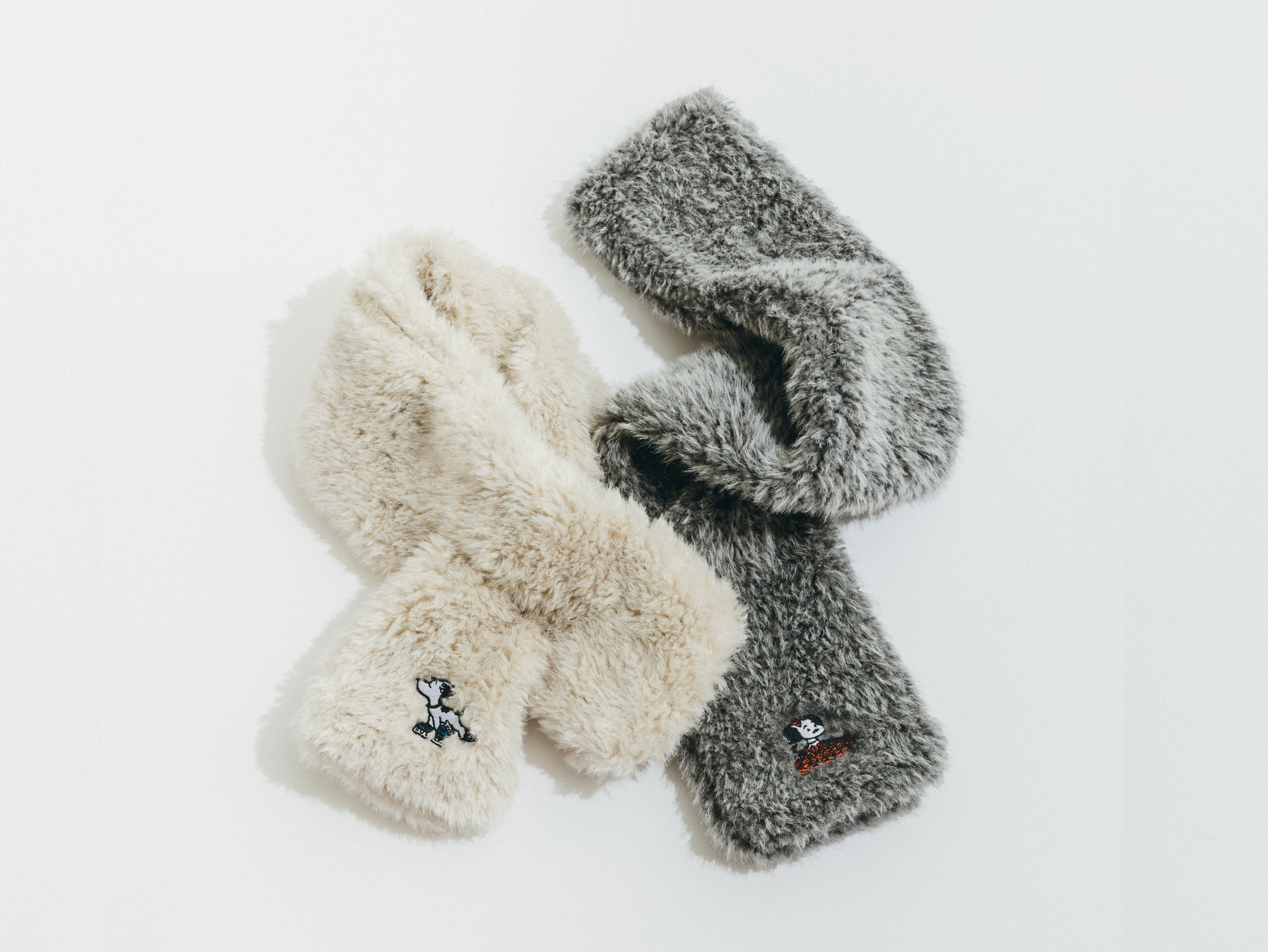 つけ心地&温かさ抜群の、もこもこ生地を使用したマフラーです。1950年代の、冬を感じるスヌーピーの刺繍がワンポイント。