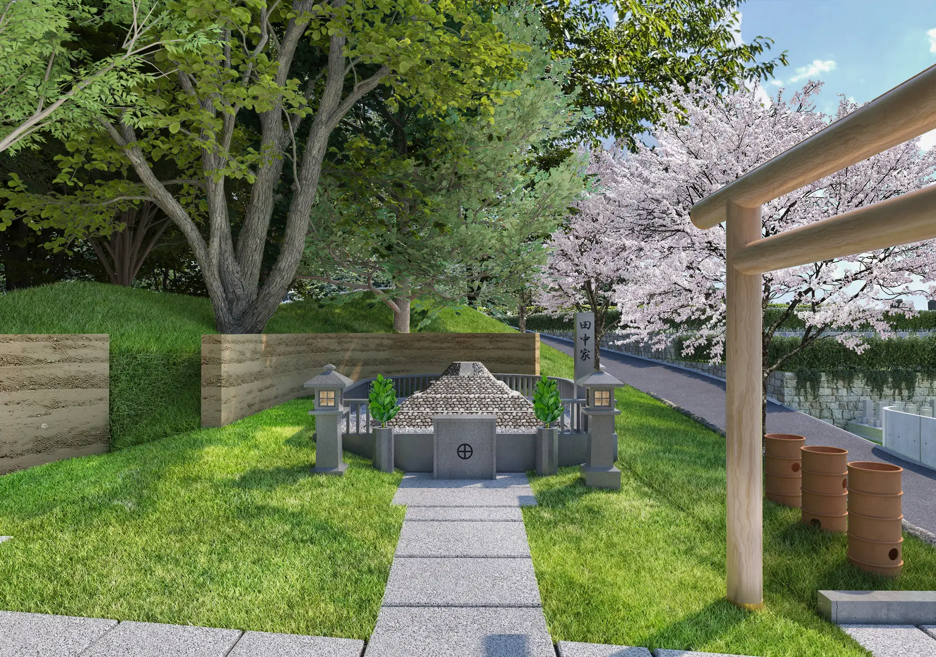 今回の「マイ古墳」は、この安藤忠雄建築研究所監修の園内においても特に見晴らしの良い、小高い丘の上に位置しています 。 春には周囲に桜が咲き誇る絶好のロケーションに専有地を整備し 、四季折々の自然と共に、ご家族だけで静かに祈りを捧げられる環境をご提供します 。