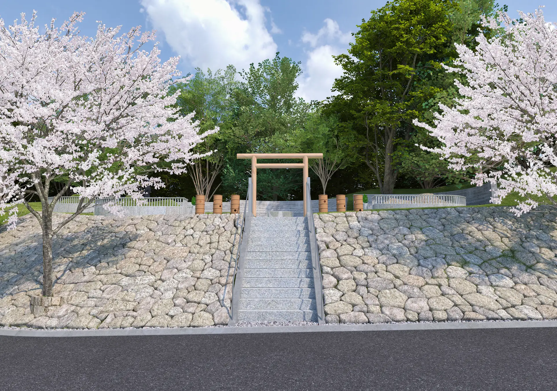 【使用石材】:すべての部材に国産最高級「庵治石」を使用(墳丘の玉砂利、外柵、石塔、灯籠など)