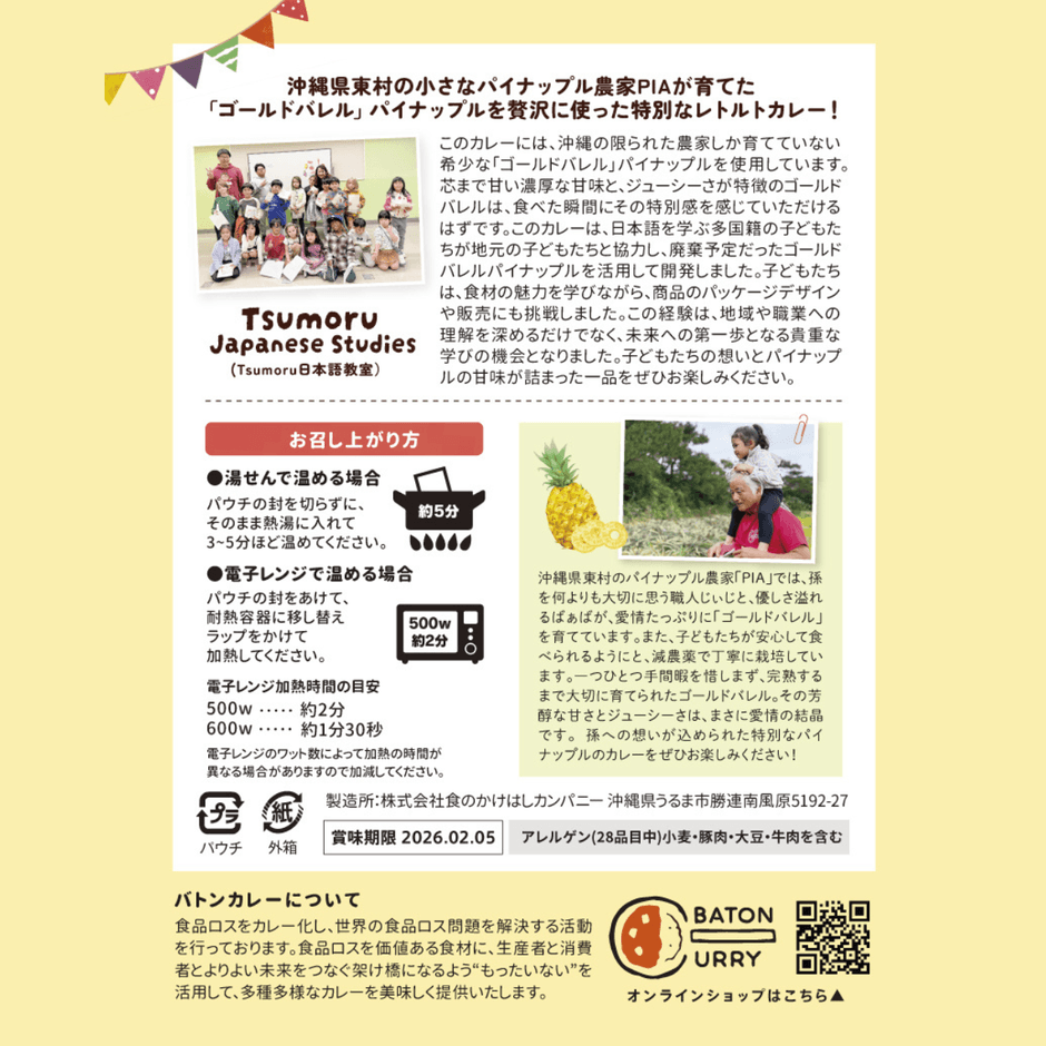 レトルトカレーにより食品ロス削減を図るMOTTAINAI BATON株式会社(所在地:東京都国分寺市、代表:目取眞 興明(読み:めどるま こうめい)、以下「モッタイナイバトン」)は、外国籍の子どもたちへの日本語教室を運営する株式会社Tsumoru(所在地:沖縄県那覇市、代表:潮平 菜津美(読み:しおひら なつみ)、以下「Tsumoru」)と共同開発した『ポークパイナップルカレー』を2025年2月9日(日)より当社公式オンラインショップ等にて発売します。