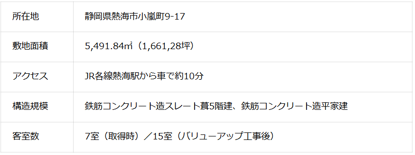 当社は、「MACHIづくり共創会社」として、地方創生および地域活性化を目的としたホテル・旅館等へ不動産投資事業を積極的に展開しており、本日付で静岡県・熱海エリアの中心地の小嵐町に位置する温泉旅館(既存施設名称:シオン熱海、以下「本物件」)を取得いたしました。
