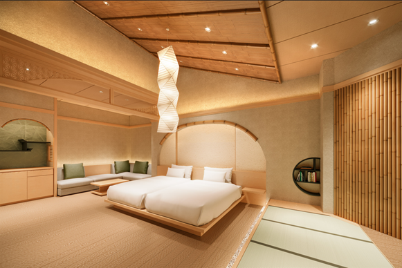当社は本物件を取得後、既存棟に対しては一部増室工事を含むフルリノベーション工事を行い、更には敷地内に客室の増築工事を行う計画です。これらのバリューアップ工事完了後は、全室露天風呂付き客室のデザイン性に優れたラグジュアリーグレードの温泉旅館へと再構築してまいります。