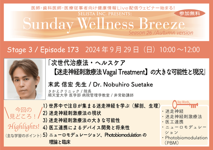 《医師・歯科医師・薬剤師向け》 無料オンラインセミナー9/29(日)朝10時開催 『次世代治療法・ヘルスケア 【迷走神経刺激療法 Vagal Treatment】の大きな可能性と現況』 講師:末武 信宏 先生(さかえクリニック/院長)