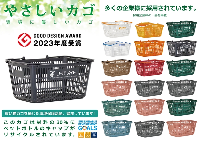 株式会社スーパーメイト(本社:岐阜県羽島郡笠松町、代表取締役:山下 智則)は、材料のプラスチックの一部にペットボトルキャップをリサイクルした買い物カゴ『ボトルキャップバスケット』が、2023年10月にグッドデザイン賞2023を受賞したことを発表いたします。